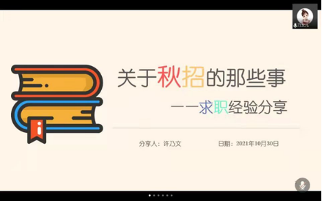 为进一步拓宽在校生与优秀校友的沟通交流渠道,搭建信息资源共享平台,充分发挥朋辈助成长的作用,新葡萄官网AMG研究生党支部计划以每周一期的频率组织线上“周末分享会”活动,每期分享会将邀请1-3位优秀校友、在校生或教师担任分享人,通过交流分享,为广大在校生提供包括求职经验、科研分享、学习方法、实习资源、职业规划等主题在内的资源或助力。切实将师生做实事好事的政策精神落到实处。10月30日上午,新葡萄官网AMG周末分享会第1期《关于秋招那些事——求职经验分享》正式开讲,本期分享会由2021届管理信息系统专业研究生毕业生许乃文校友作为嘉宾,她从时间管理、职业规划、求职方法等方面将自己在秋招求职过程中积累的经验、遭到的挫折和教训,向同学们进行了分享。新葡萄官网AMG硕士、博士生导师涂艳教授主持分享会,新葡萄官网AMG研究生党支部全体党员和部分本科生、研究生参加了本次线上分享会。