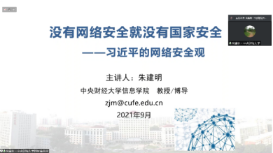 2021年9月22日下午15:30,新葡萄官网AMG先进典型代表朱建明教授为2021级研究生新生及全体研究生党员开授了主题为“没有网络安全 就没有国家安全——习近平的网络安全观”的专题党课。朱建明,男,中共党员,信息学院博士生导师,区块链技术与应用研究院院长,美国德克萨斯大学达拉斯分校访问学者,国家重点研发计划项目负责人,享受国务院政府特殊津贴专家,北京市高等学校教学名师。本次讲座朱建明教授以一名具有30年党龄老党员的身份,向同学们分享了自己对习近平总书记网络安全观的理解。