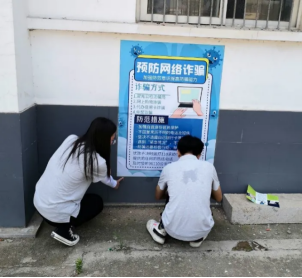 上午,队员们到达高庄村之后,将印有常见网络诈骗方式、如何防范电信网络诈骗等知识的宣传海报张贴在村庄的醒目位置。