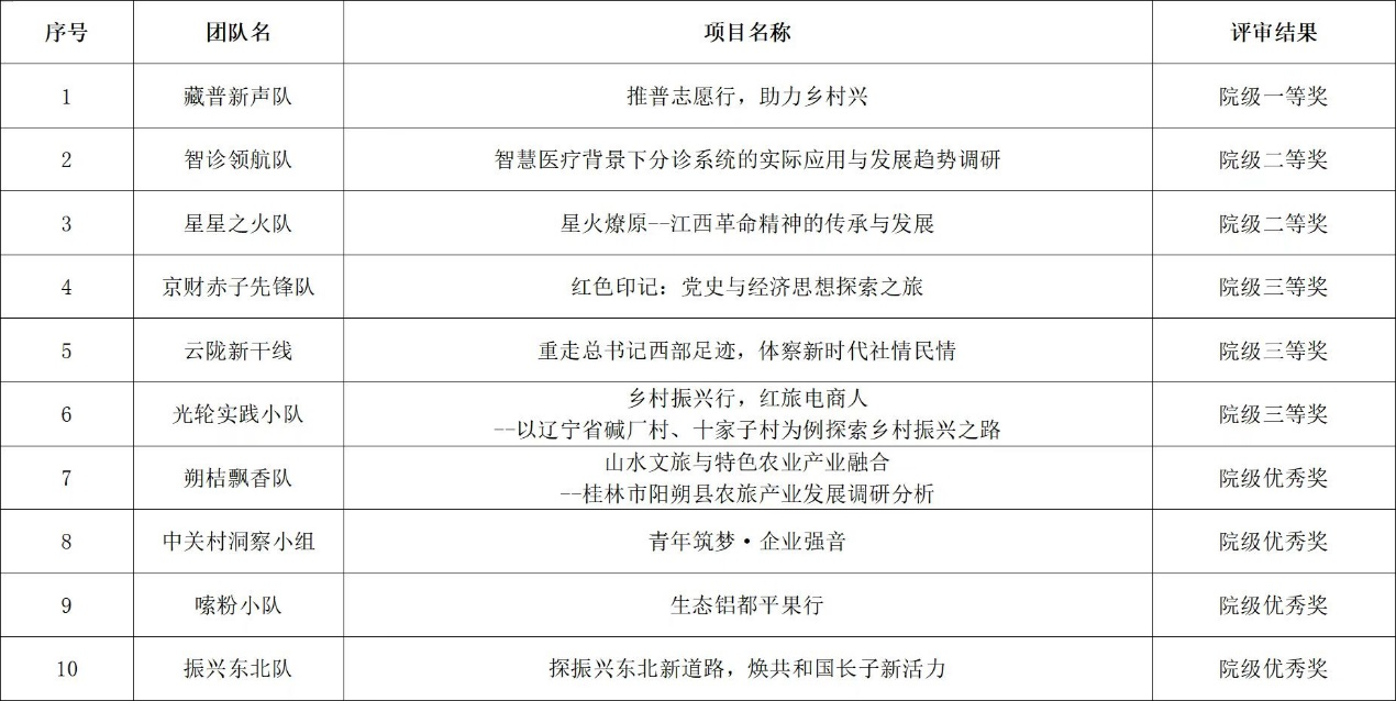 在答辩评审会后,经过新葡萄官网AMG团委副书记贺译民老师和信息管理系副主任李惠老师的评审,共有六支队伍获社会实践优秀团队推选资格,马艺萌同学获社会实践优秀个人推选资格,公示结果如下: