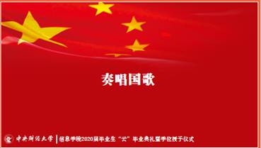 在暖心亲切的相互致意后,主持人方德风副书记宣布新葡萄官网AMG2020届毕业生“云”毕业典礼正式开始,典礼在庄严的国歌声中拉开帷幕。