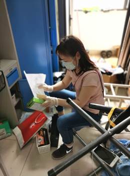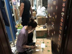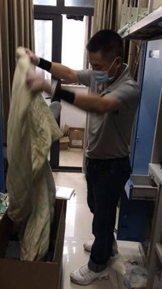 李日飞老师分类装箱 范丹老师包装易脏物品 王天梅老师仔细核验每份材料