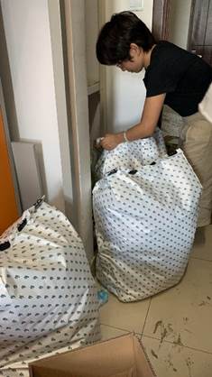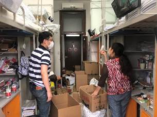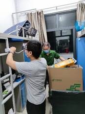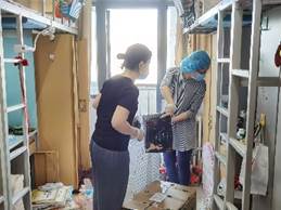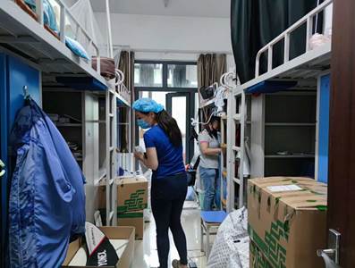 每天宿舍4名毕业生和负责打包的老师们就早早“云集”在线上平台,打开手机视频通话,让远在家中的同学们亲眼见证“云整理、云打包”全过程。从床铺、书桌到衣柜、阳台,老师们分工合作,一步步“清空”区域;从被褥、书籍到服饰、零碎物品,老师们一件件耐心询问学生,细心将物品分门别类,打包得井井有条。清理、归置、备箱、装箱、称重、封装、贴单,最后在箱子上标注包裹信息,一件爱心包裹则在待寄中。