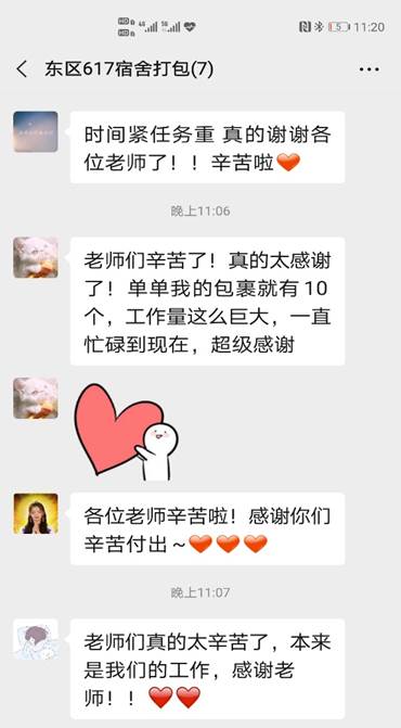 炎炎夏日,这一箱箱的行李背后承载的是满满的汗水和感动。长弯腰,搬重物,从清晨到傍晚,即使汗流浃背,即使腰酸背痛,老师们也毫不懈怠。有的老师主动承担搬运行李的重任,背上早早贴上了膏药贴;有的老师打包过程中与熟悉的学生视频,视频对面的同学们感慨“毕业前再见最后一眼,看一眼宿舍,再看一眼老师”;有的老师连续打包将近十五小时,中途仅仅出去匆匆吃了顿午餐,“梦里都在打包行李”,老师笑道:“现在摇身一变快递小哥,精准快稳”。“连续直播打包十几个小时,手机电量都比以前掉得快多了”老师举着电量不足的手机打趣道。动作越来越快,配合越来越熟练。短短几天内,老师们练就了媲美双十一期间打包员的工作能力。游刃有余的工作背后,是老师们额前细密的汗水、日趋疼痛的腰背和早出晚归的疲惫。保质保量的完成背后,是老师们欣慰开心的笑容、不负重托的感动和毕业祝福的点赞。