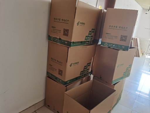 宋庆东老师认真组装箱子 王焱老师分类装箱 唐小毅老师沟通包装易碎物品