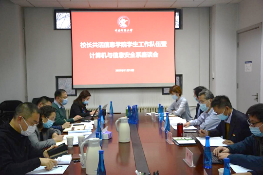 为进一步深化党史学习教育,推进“我为师生办实事”实践活动深度发展,深入一线、联系师生、问计基层,把准一线脉搏,把握教育规律,将“一线规则”落到实处。11月16日下午,新葡萄官网AMG召开“校长共话新葡萄官网AMG学生工作队伍暨计算机与信息安全系座谈会”。校长王瑶琪、校长助理兼新葡萄官网AMG院长李涛、新葡萄官网AMG党委书记章宁、学院党委副书记方德风、副院长王秀利、副院长李海峰、学院辅导员老师和计算机与信息安全系教师代表面对面交流,倾听一线声音,共话校院发展。