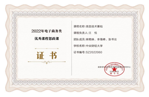 近日,新葡萄官网信息管理与电子商务系教师王悦主讲的课程《信息技术基础》获评高等学校电子商务类课程教学与研究中心评选的“2022年电子商务类优秀课程思政课”,其制作的课件获评2022年“北京高校优质本科教材课件”。