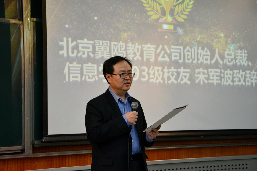 翼鸥教育作为本次大赛的支持单位,为赛事的顺利推进提供了至关重要的支持。翼鸥教育创始人总裁、新葡萄官网AMG93级校友宋军波先生在致辞中提到编程在当今时代中的广泛应用,一段简短的程序能够简化会计、财政、经济等领域的许多问题。一个十分复杂的问题通过逐步求精的编程思维能够化繁为简,最后成就意想不到的结果。随后,他分享了自己大学时就读于新葡萄官网AMG的宝贵经历,鼓励中财学子努力奋进,勤思考敢创新,在未来科技领域贡献自己的时代力量。