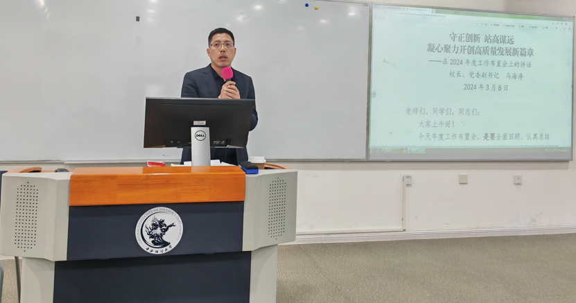 方德风书记首先传达了校党委书记何秀超对做好2024年重点工作提出的“学”“思”“抓”“担”“实”五个方面要求。何秀超书记强调,在学校即将迎来75周年校庆之际,要牢牢抓住历史机遇,把握历史方位,继续爬坡过坎、攻坚克难,推动学校事业发展再上新台阶。接下来传达了校长马海涛对2024年重点工作的部署,马海涛校长指出要围绕教育强国建设规划纲要以及学校第七次党代会和“十四五”规划和“双一流”建设目标任务,按照“一一二三四”的总体工作部署开展学校2024年的各项工作。然后方德风书记还传达了校党委副书记、纪委书记张庆东对2024年纪检监察工作的布置和校党委副书记梁勇提出的落实学校党委工作部署的要求。