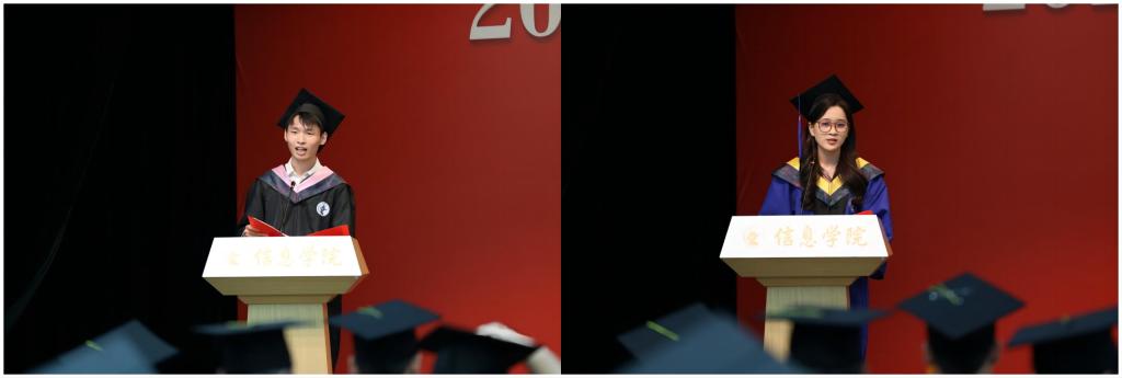 在毕业生代表发言环节,翟向阳、王玉画分别代表2024届本科生和2024届研究生发表毕业感想。翟向阳同学首先向学院、老师与亲友们表示了衷心的感谢与敬意并回顾了自己从大一到大四在母校的点点滴滴与成长过程,从中他获得了知识、技能、朋友和师生情谊,在新葡萄官网AMG这片沃土上茁壮成长。王玉画同学从学术挑战和科研任务的经历中学会了坚持、锻炼了意志更培养了能力。在迎接人生新篇章和开启新征程的道路上,信院学子也将时刻感受信院带给我们的深刻烙印和养分,在各个领域发光发热,为国家发展建言献策。