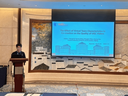 起椿淇同学在数字经济分会场中分享了题为“The Effect of Virtual Team Characteristics in Co-creation on the Quality of UGC Videos”的学术论文。该论文研究了UGC视频平台新兴的联合创作模式,基于交互记忆系统和社会资本理论探讨了虚拟团队特征和成员个人特征对视频质量的影响。文章使用了自然语言处理和计量分析方法进行了实证研究,为UGC平台的创作者和管理者优化联合创作行为提供了理论支持。