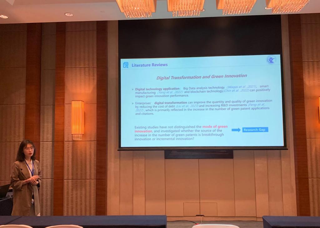 郑诗禹同学在数字创新分会场中分享了题为“Does Digital Transformation Promote Breakthrough Green Innovation? Empirical Evidence from Listed Chinese Manufacturing Companies”的学术论文。研究表明,随着当前数字经济的快速发展,尽管中国制造业企业数字化转型促进了企业绿色创新,但表现出明显的技术相似性。该研究为制造业企业绿色化转型提供了经验支持,也为培育企业选择高质量绿色创新方式提供了新思路。
