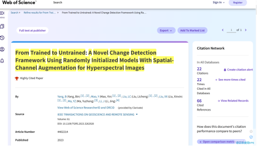 根据科睿唯安最新ESI数据,新葡萄官网AMG李静副教授作为唯一通讯作者,于2023年发表在IEEE TRANSACTIONS ON GEOSCIENCE AND REMOTE SENSING(TGRS)上的文章“From Trained to Untrained: A Novel Change Detection Framework Using Randomly Initialized Models With Spatial-Channel Augmentation for Hyperspectral Images”,截至目前,在Web of Science中共被引用22次,被评为ESI高被引论文。该论文主要借助深度学习算法解决基于高光谱图像的地物变化检测问题。