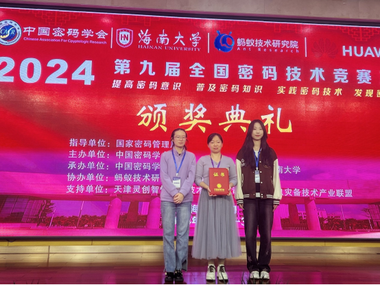 2024年11月28-30日,第九届全国密码技术竞赛决赛和颁奖典礼在海南大学成功举办。新葡萄官网AMG段美姣老师指导的参赛团队,由2022级信息安全专业学生徐嘉璐、杨雨霏、吕睿组成,历经初赛、复赛和决赛的激烈角逐,最终凭借参赛作品“商用密码SMS4算法的安全性分析”荣获全国三等奖。